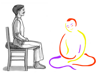 S’asseoir simplement par terre, sur un coussin, en tailleur ou dans une autre position, ou simplement sur une chaise, ou un tabouret, à la convenance. Sans contrarier son corps ni se faire mal, trouver la position corporelle adéquate pour se sentir ancré à la terre, et à l’aise afin d’être en mesure d’observer tout ce qui va se passer dans notre intériorité. L'essentiel étant de se familiariser avec une attitude extérieure-intérieure nous permettant de se voir dedans, sans se préoccuper de l'aspect extérieur que prendra notre personnifié.